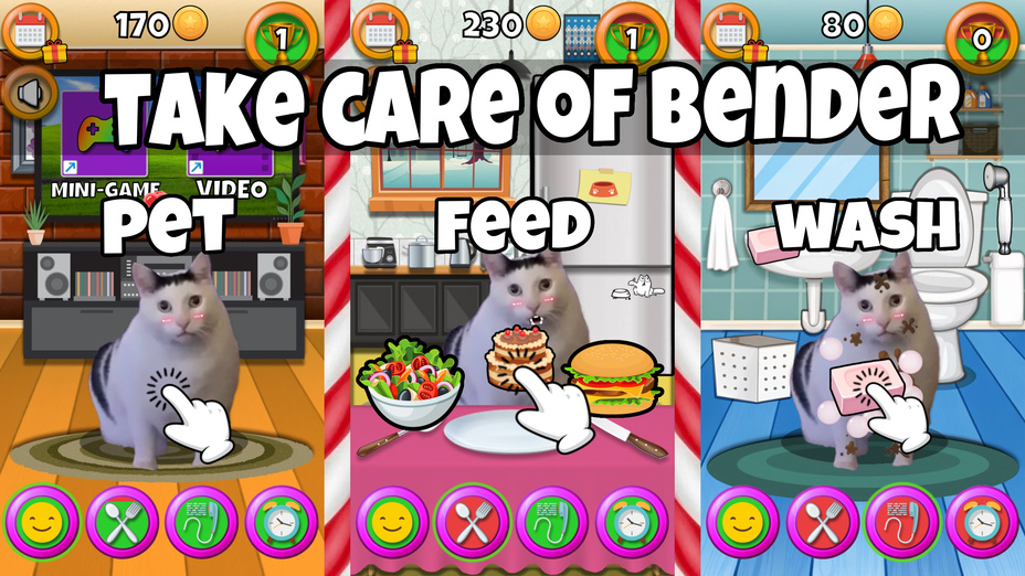 Pour profiter pleinement Meme Chats: Tamagochi, n'oubliez pas de vérifier réguliÚrement les besoins de Bender. Les soins pour animaux de compagnie sont essentiels, alors équilibrez l'alimentation, le lavage et l'habillage pour garder son mÚtre de bonheur élevé. Participez au mini-jeu de fusion pour accumuler plus de piÚces pour débloquer des objets élégants et habiller votre chat de maniÚre unique. Les joueurs fréquents qui terminent des défis quotidiens recevront des bonus, améliorant ainsi le plaisir général.