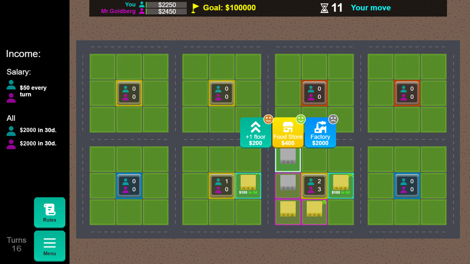 Minicity Tycoon 2: Build a Business City est un jeu de stratĂ©gie Ă©conomique exaltant dans lequel vous pouvez construire et gĂ©rer votre propre empire urbain. Jouez en ligne gratuitement sans tĂ©lĂ©chargement et plongez dans l'atmosphĂšre palpitante de la construction de la ville et de la planification stratĂ©gique. Avec son mĂ©lange unique de Monopoly, SimCity et Tic-tac-toe, ce jeu offre une expĂ©rience engageante oĂč chaque match est une nouvelle aventure. Affrontez une IA intelligente en achetant stratĂ©giquement des terrains, en construisant des bĂątiments et en lançant des entreprises rentables. Le jeu propose des combinaisons alĂ©atoires de quartiers rĂ©sidentiels, commerciaux et industriels, vous mettant au dĂ©fi de prendre des dĂ©cisions complexes pour assurer la prospĂ©ritĂ© de votre ville.