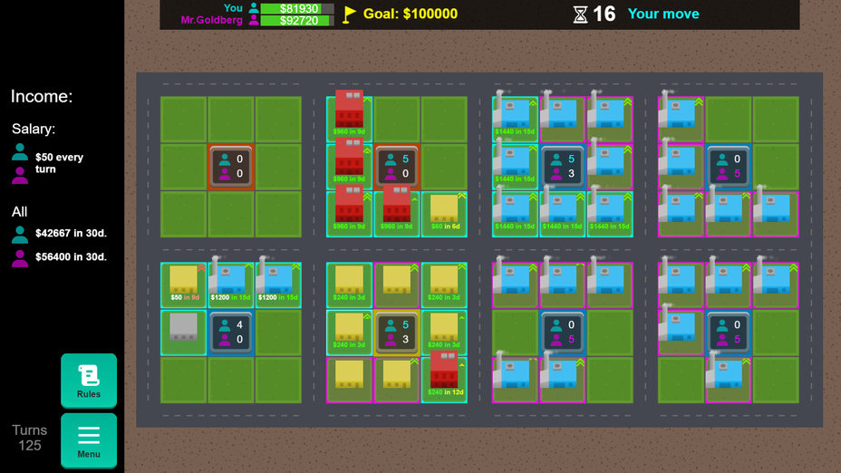 Dans MiniCity Tycoon 2: Construisez une ville d'affaires, vous prendrez le contrÎle d'un magnat en herbe pour atteindre l'objectif principal de devenir le magnat des affaires le plus riche. Vous rencontrerez de nombreux niveaux, chacun présentant des emplacements uniques, des adversaires divers et un systÚme de gestion économique innovant. Le jeu convient aux joueurs de tous ùges qui aiment la réflexion stratégique et les défis économiques. Planifiez minutieusement vos actions, évaluez la rentabilité des commerces des différents quartiers, et suivez votre bilan pour une prise de décision optimale. Que vous construisiez des magasins, des bureaux ou des usines, utilisez votre logique et vos compétences économiques pour dominer l'arÚne de la construction de villes.