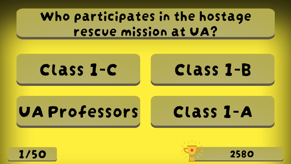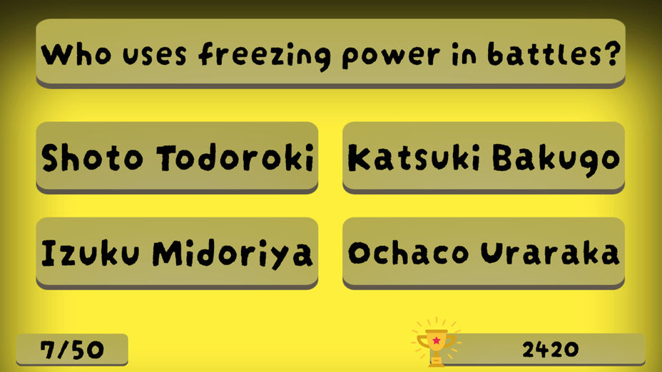 My Hero Academia - Quiz offre un moyen interactif aux fans de s'immerger dans l'univers riche de la série. Avec des graphismes attrayants et une interface simple, les joueurs peuvent rapidement saisir la jouabilité. Il ne s'agit pas seulement de répondre à des questions ; c'est une expérience captivante qui vous incite à vous souvenir de faits significatifs concernant vos héros et méchants préférés !