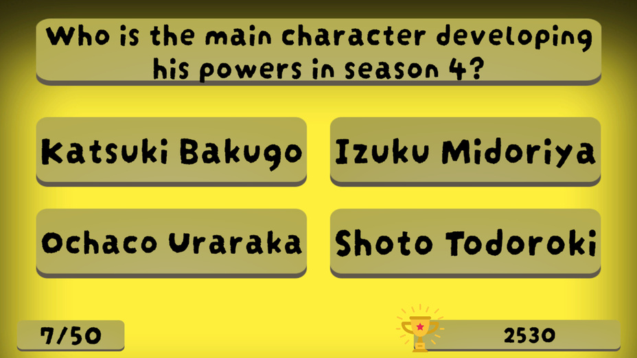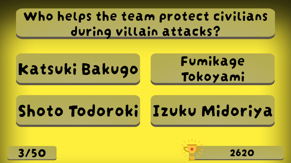 My Hero Academia se distingue comme une franchise d'anime et de manga adorée qui a captivé des fans du monde entier depuis ses débuts en 2014. Ses thÚmes d'héroïsme et de persévérance ont ouvert la voie à diverses adaptations, y compris ce jeu de quiz captivant qui permet aux joueurs de s'engager davantage avec le contenu et de tester leur passion !