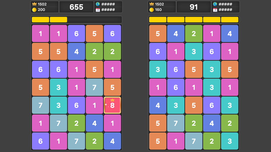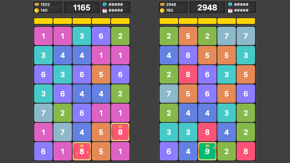 Les contrÎles de Number Click Merge sont simples et faciles à maßtriser. Les joueurs utilisent leur souris ou leur écran tactile pour cliquer sur les tuiles de numéros correspondants sur la grille. Lorsque deux nombres égaux sont cliqués, ils fusionnent en une seule tuile avec une valeur d'incrément égale à la somme des deux nombres d'origine. L'objectif est de combiner stratégiquement les nombres pour progresser dans les niveaux et obtenir des scores plus élevés.