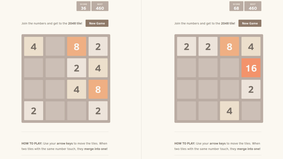 Pour profiter de 2048 sur votre tĂ©lĂ©phone ou ordinateur, dĂ©placez les tuiles Ă l'aide des touches flĂ©chĂ©es ou balayez dans la direction dans laquelle vous souhaitez combiner les tuiles. Le processus de fusion se produira automatiquement lorsque deux tuiles du mĂȘme numĂ©ro entreront en collision. Gardez un Ćil sur votre score total et efforcez-vous de battre votre record prĂ©cĂ©dent!