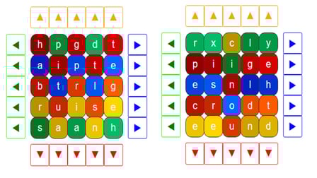 Commencez par vous familiariser avec la grille 5x5 remplie de lettres aléatoires. Utilisez les flèches autour de la grille pour faire pivoter soit une rangée, soit une colonne spécifiques. Votre objectif est de former cinq mots acceptés en déplaçant les lettres. Une fois que vous pensez avoir formé les mots corrects, il vous suffit d'appuyer sur le bouton de vérification pour valider vos suppositions !