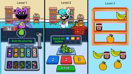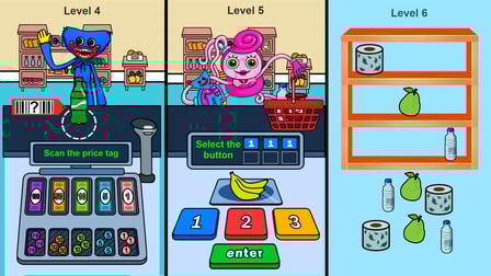 Pour commencer votre aventure dans Supermarket Poppy Playtime, sélectionnez un mini-jeu dans le menu. Sur un mobile, appuyez sur l'écran pour interagir et suivez les instructions pour accomplir les tâches. Les utilisateurs d'ordinateur peuvent cliquer et faire glisser des articles ou saisir des numéros pour gérer les transactions. L'essentiel est de rester concentré et rapide !