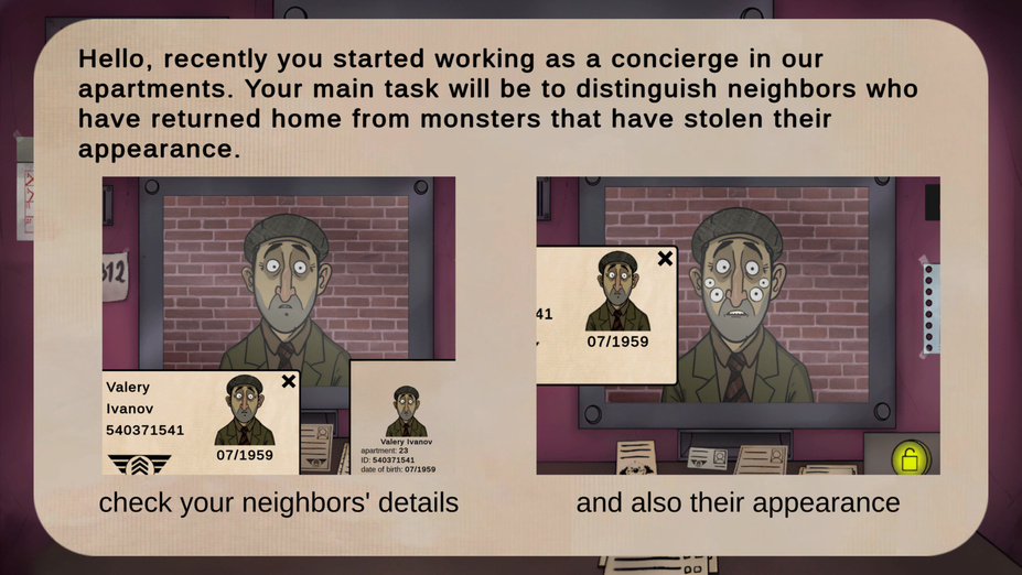 Ce N'Est Pas Mon Voisin! Ou est-Ce? est un jeu d'horreur intrigant qui invite les joueurs dans le monde étrange d'un immeuble rempli de sosies et de monstres imitant les humains qui se fondent parfaitement avec les résidents. Ce jeu en 2D combine de maniÚre créative des éléments de suspense et de stratégie, mettant les joueurs au défi de naviguer dans leur environnement tout en discernant les vrais voisins de leurs étranges doubles. En tant que gardien d'immeuble chargé d'identifier ces sosies, les joueurs doivent s'engager dans un objectif effrayant qui exige vigilance et esprit critique.