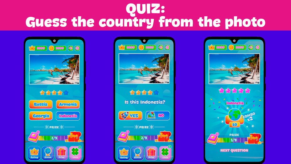 Dans Trivia Quiz: Devinez le pays, vous prendrez le contrÎle de votre intellect pour conquérir des milliers de questions basées sur la géographie. Vous rencontrerez de nombreux niveaux, des lieux uniques et une variété de questions difficiles qui mettront vos connaissances à l'épreuve. Affrontez d'autres joueurs et grimpez dans le classement du classement. Ce jeu est idéal pour les enfants et les adultes qui cherchent à tester leurs compétences cognitives de maniÚre amusante et engageante. Connectez-vous quotidiennement pour recevoir des récompenses spéciales et débloquer une collection de personnages amusants pour garder votre gameplay frais et excitant.