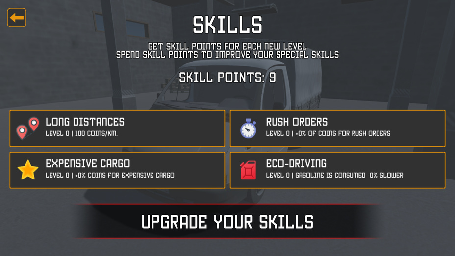 La mise Ă niveau de votre camion peut ĂȘtre effectuĂ©e dans le menu garage, oĂč vous pouvez investir dans diverses amĂ©liorations telles que la puissance du moteur et l'efficacitĂ© Ă©nergĂ©tique.