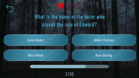 TWILIGHT-mega quiz est un jeu de quiz exaltant où vous pouvez tester vos connaissances sur la saga emblématique des vampires. Jouez en ligne gratuitement sans téléchargement et plongez - vous dans le monde mystérieux des vampires et des loups-garous. Que vous soyez un fan inconditionnel ou que vous débutiez, ce jeu basé sur un navigateur captivera votre imagination et mettra au défi vos compétences en matière de trivia sur les appareils de bureau, Android et iOS. Plongez dans le royaume du surnaturel, explorez les traditions fascinantes et profitez d'un jeu qui ne nécessite aucune inscription, ce qui le rend parfait pour les adolescents et les adultes.