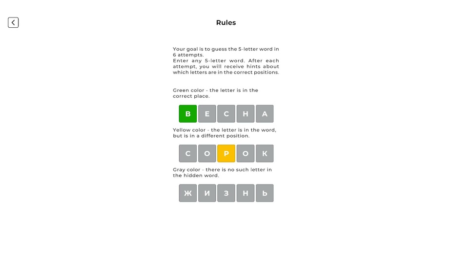 Wordle plonge les joueurs dans une interface minimaliste, complĂ©tĂ©e par des animations Ă©lĂ©gantes qui amĂ©liorent l'expĂ©rience. En devinant le mot cachĂ© de 5 lettres, apprenez â en un peu plus sur les aliments nationaux dans les langues correspondantes-Russe, tatar et anglais. Cette fonctionnalitĂ© ajoute une touche Ă©ducative Ă votre aventure amusante. DĂ©fiez-vous et les autres dans une course contre le temps et les mots!