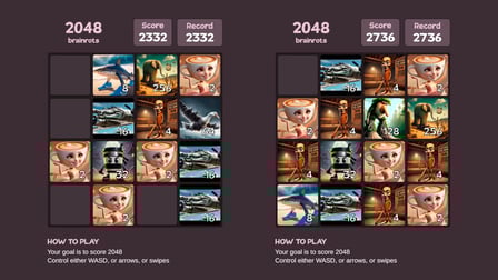 Playing 2048 brainrots is straightforward. On your computer, use the WASD keys or arrow keys to slide the tiles in the desired direction. If you’re on a mobile device, simply swipe left, right, up, or down. Your goal is to combine the numbered tiles by sliding them together — keep an eye on your board and strategize wisely!