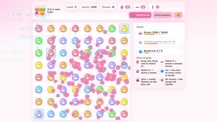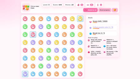 Playing 3 in a row: Cats is both fun and straightforward! On your phone, tap on tiles to swap adjacent ones, aiming to match three or more of the same type. For computer users, click and drag to make the swaps. Your main goal is to break layers of ice or hard jelly while ensuring that the fish makes its way to the bottom of the board.