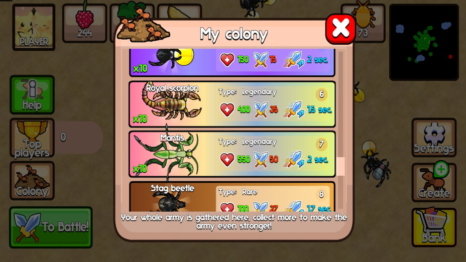Getting started with Ant Colony is straightforward. Collect resources scattered around the map and bring them back to your colony. As you accumulate resources, you can upgrade your ants and capture other creatures to bolster your army. Use strategic maneuvers to attack other colonies and defend against enemy ants. The intuitive controls and user-friendly interface make it easy for players of all ages to dive into the action.