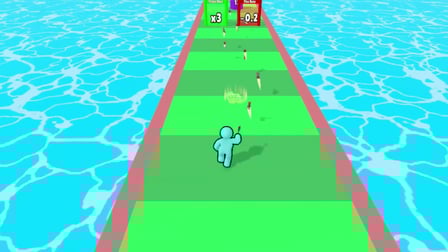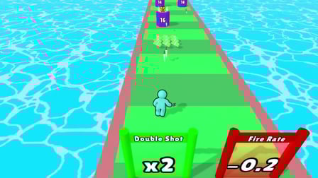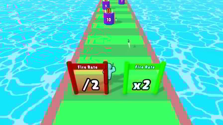You auto-run forward on a straight track over water. Swipe left or right (hold right mouse button on desktop, finger swipe on mobile) to steer through green positive gates and avoid red negative ones. Pick "Fire Rate x2" over "/2" unless you want to crawl through the level.