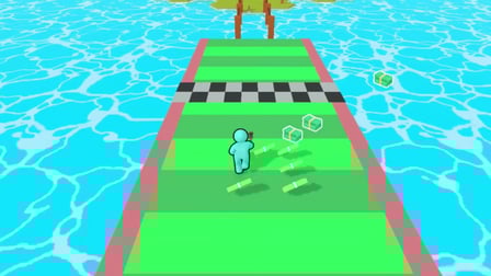 Grab floating cash bundles during the run and at the finish line. Between levels, spend it on permanent upgrades like fire rate, range, and damage. The upgrades carry over, so early levels become trivial after a few runs.