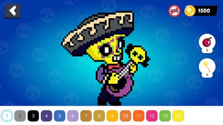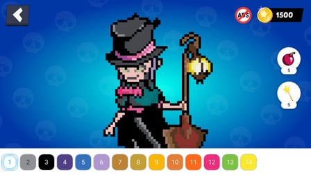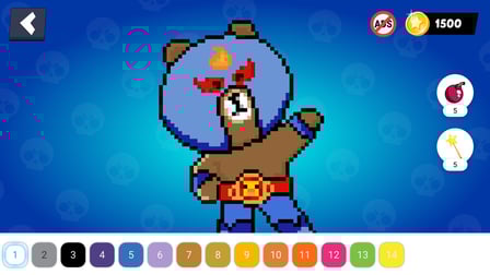 You can use a bomb to color large areas quickly and a magic wand to fill all adjacent pixels of the same color, making your coloring experience more exciting!