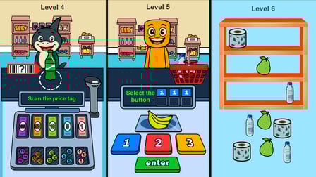 Navigate the game using the following controls: 1. Use your mouse or touch to select items and complete tasks. 2. For counting change, input your answer using the number keys. 3. Tap quickly for the punching game to mimic a rhythm for product selection. 4. Drag and drop items with your mouse or finger to place them correctly on the shelves.