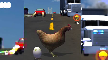 "Chicken Royale" is an online multiplayer arcade game where players control chickens in a battle royale style competition, navigating obstacles and avoiding traffic to be the last one standing.