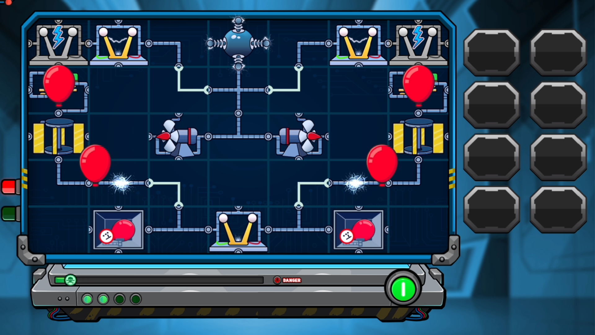 The goal is to arrange components on a grid to create a functional circuit that powers up when activated.