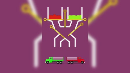 Color Fall invites you to open paths for liquids to reach their color-matched trucks while avoiding the disruptive black liquid. This strategic puzzle game features 30 levels of increasing difficulty. Your task is to slide pins to direct the flow of colors, ensuring the safe delivery of each liquid to its corresponding truck. Be cautious, as mixing with the black liquid will result in evaporation and a level restart.