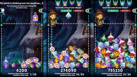 Begin your potion-making journey by simply dragging your mouse over connected elixirs if you’re on a computer. If you’re playing on a phone, tap and swipe to link them together. Aim to connect at least three identical elixirs to compound your potions and advance through the levels.