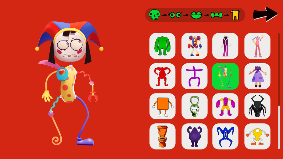 Digital Circus: Create Monster invites you to dive into a world of creativity where you can design your own unique monsters. If you're a fan of the Digital Circus series and love creating quirky characters, this game is just for you! With a variety of options for heads, eyes, mouths, bodies, and accessories, you can let your imagination run wild. Once your monster is complete, watch it come to life with some incredible dance moves. Ready to create the most memorable monster? Play now and explore a universe of fun and creativity!