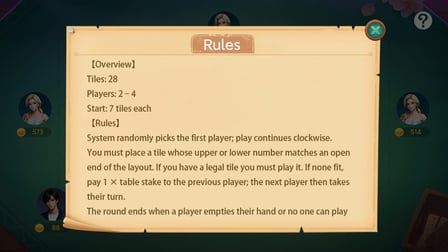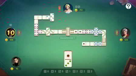 Step into the world of DominoGaple by picking your desired number of players. Each player draws 7 tiles to begin. The game starts with the first player placing a tile, and each subsequent player must place a matching tile to the current chain. If you can't play a tile, draw from the boneyard until you can. Keep your eyes on the prize — be the first to go out or have the fewest pips in a stand-off!