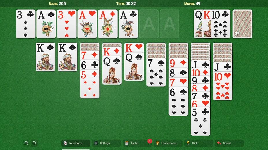 Start your journey by delving into this game using a mouse on computer or by tapping on your screen if you're on a mobile device. Aim to stack the cards in the correct sequence and suit on the foundation piles. Drawing 1 or 3 cards from the deck can be selected at the beginning for varied difficulty. Utilize hints if you're unsure about your next step, or undo moves to try different strategies.