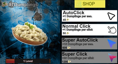 Collect enough dumplings by clicking rapidly, then use them in the upgrade menu to enhance your abilities.
