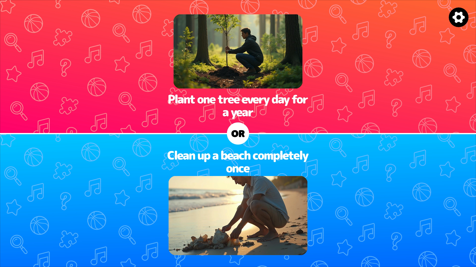 This innovative game concept draws inspiration from the traditional "Would You Rather" format, blending it with an Earth Day theme to raise awareness about environmental issues. It was developed to spark conversations and inspire positive actions toward a sustainable future, making it a perfect choice for eco-conscious players.
