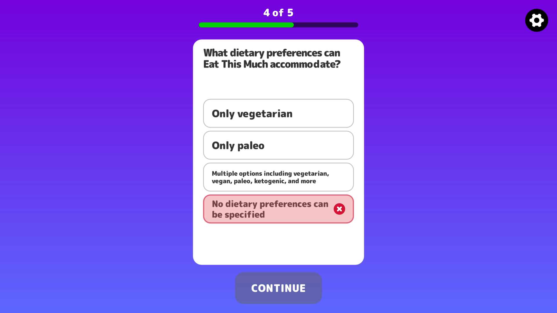 Getting started with Eat This Much is simple. Choose your answer from the provided options by clicking on it. Each correct answer earns points, bringing you closer to mastering the game. The questions will vary in difficulty, so stay alert and think quickly!