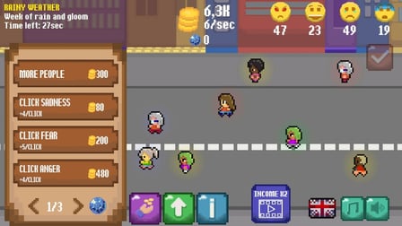 The controls are simple! Click to collect emotions, and use your mouse or touch controls to navigate the market interface, making trades and purchases with ease. On a mobile device, tap to gather and swipe to manage your emotions effortlessly.