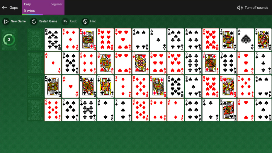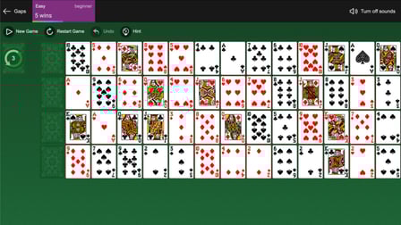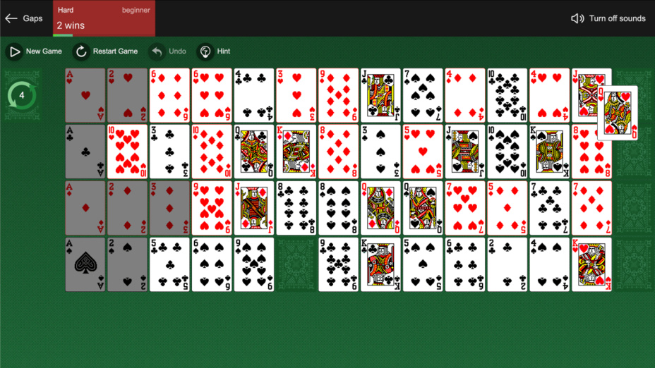 Gaps Solitaire is an engaging solitaire card game that challenges players to strategically arrange cards in ascending order. The game is played using a standard deck of playing cards, and its unique concept involves filling gaps with cards of the same suit, making it a fun and thought-provoking challenge for both kids and adults. Unlike traditional solitaire games, Gaps Solitaire allows players to utilize empty spots on the board as they aim to create sequences from Ace to King across four rows. The blend of strategy and luck makes Gaps Solitaire an exciting option for anyone looking to improve their card-playing skills.