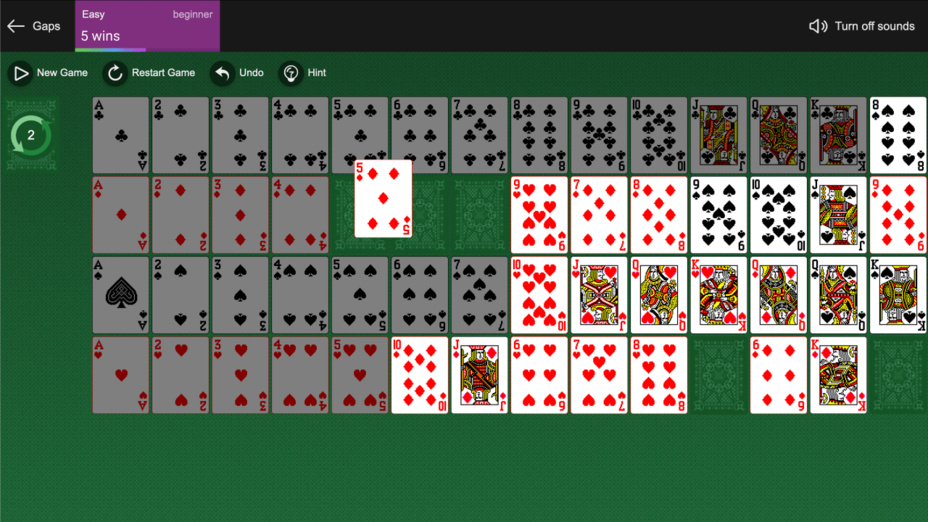 Gaps Solitaire has been developed as an HTML5 game, making it easily accessible on various platforms, including desktops and mobile devices. As a fun and free online game, it appeals to both casual gamers and those looking for a challenging solitaire card game. With a user-friendly interface and smooth gameplay, Gaps Solitaire has gained positive ratings from players seeking a blend of strategy and entertainment.