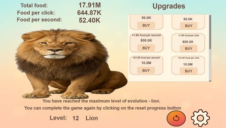 Embark on an endearing adventure in Kitten's Journey, a delightful free clicker simulator where you guide a charming little kitten on its path to evolution, helping it transform into a majestic lion! Engage in captivating gameplay as you earn food by clicking, continually upgrading your companion’s skills while reveling in the satisfaction of watching your kitty grow into new, more powerful, and beautiful feline forms.