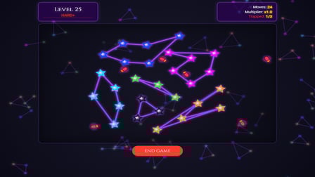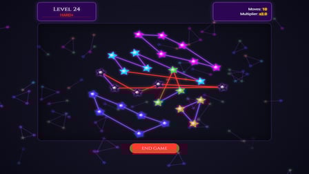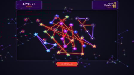 In Ley Lines, simply click on two dots to swap them. Ensure that your moves strategically eliminate the red lines (intersections) while maximizing the number of purple lines (clear connections). Your choice of swaps can significantly affect your performance and final score!