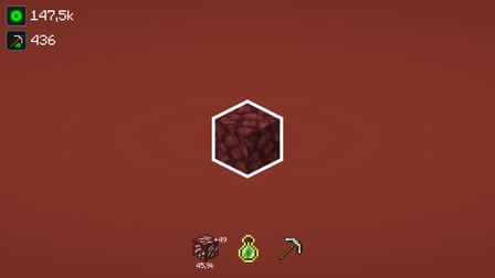 Players click on blocks to gather resources and experience. Incremental upgrades and unlocks enhance the gameplay experience.
