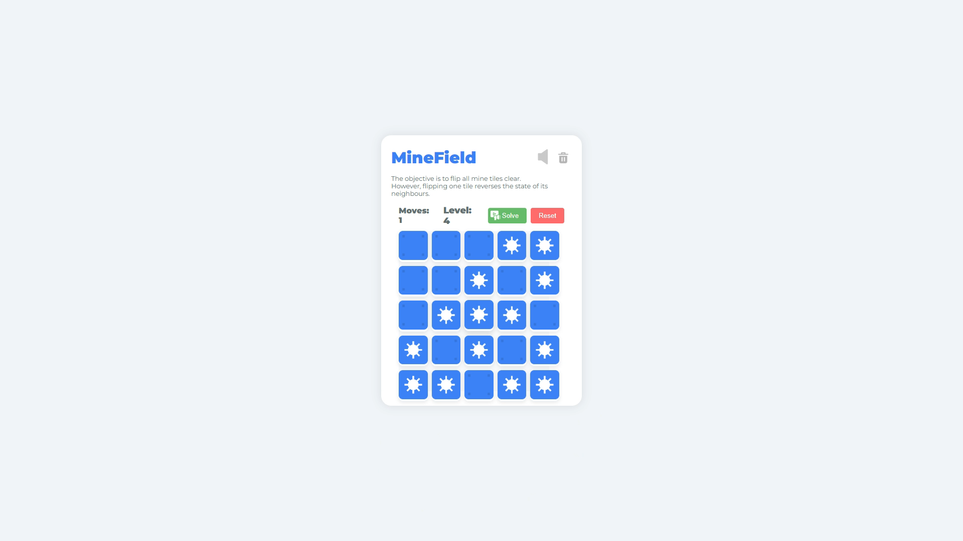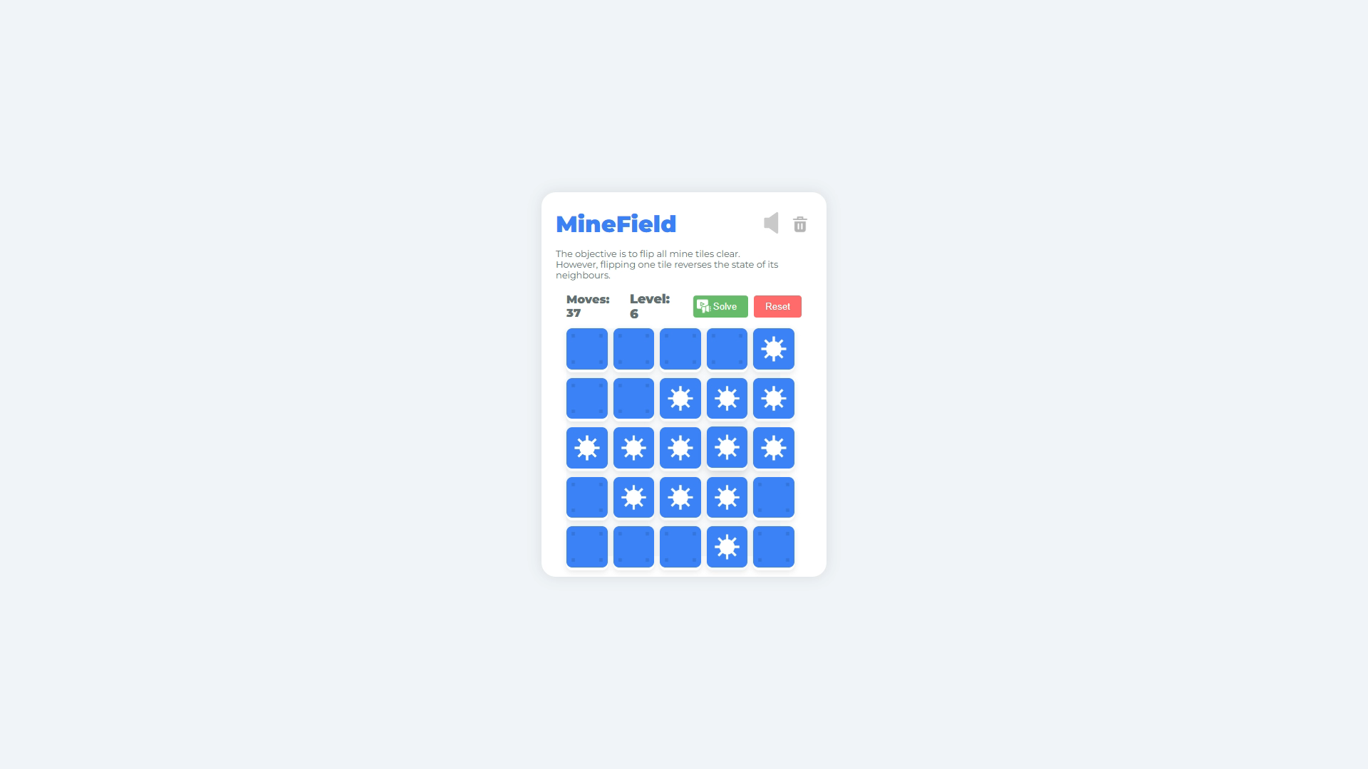Begin your MineField adventure by clicking or tapping on a tile to flip it and its adjacent tiles. Your objective is to reveal the entire grid without detonating any mines. Use the reset button if you need a fresh start on the current level. For guidance, the solve button will reveal the solution. Manage sound effects with the mute button and clear your progress with the delete button if you wish to restart from level 1.