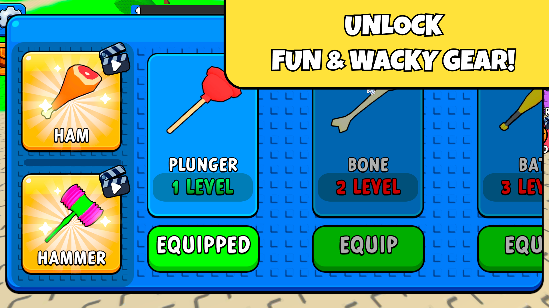 - Unlockable Gear: Earn experience to unlock wacky weapons and cosmetics, from skeleton bones to crowns.