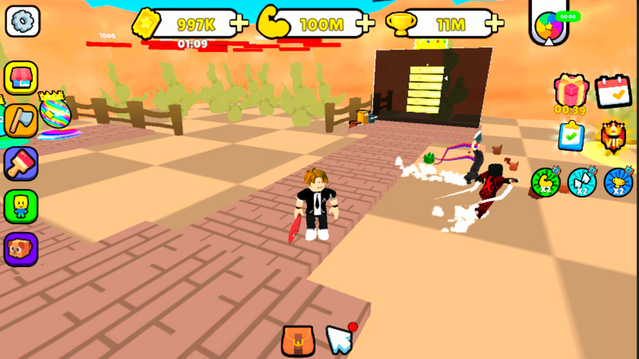 Playing Obby: Lumberjack Life Simulator is a breeze! Start by selecting a character to customize your look. Use your mouse or touch controls to chop trees scattered across various locations. Fulfill quests by collecting the required resources and explore multiple tracks to uncover free rewards. The store allows you to spend your earnings on new skins and vital potions for boosts.