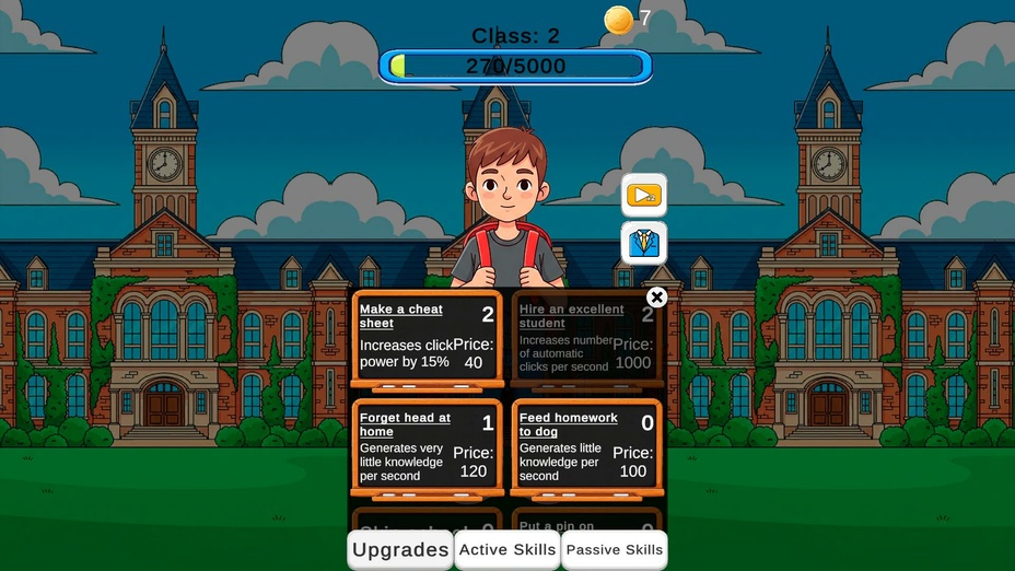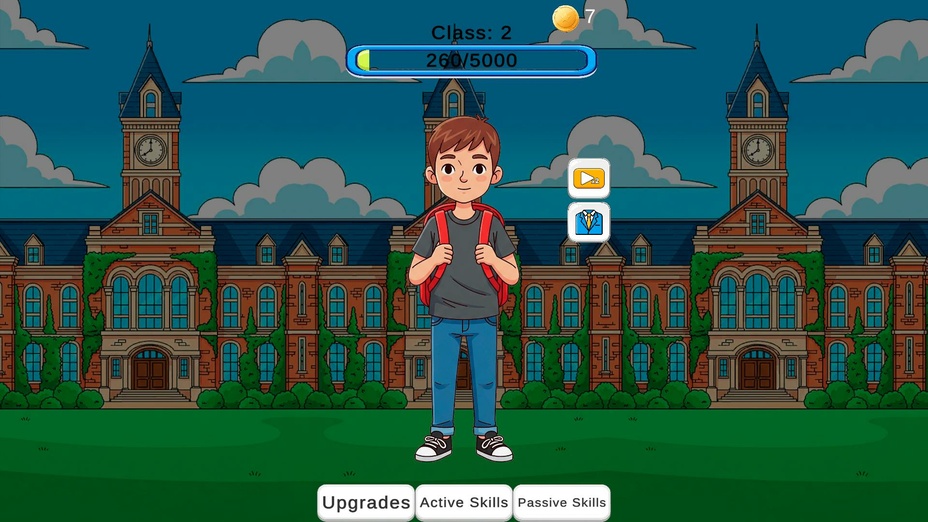 Start playing on your phone or computer by visiting the game page. Simply click items on the screen to earn knowledge points. As you progress, use the points to upgrade skills and unlock new classes. Remember: timing and strategy in your actions are key to advancing through the school ranks!