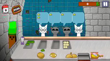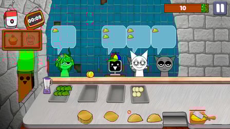 Navigate through the game using your keyboard or touch screen. The arrow keys allow you to move your Sprunk, while the mouse click is used for interacting with kitchen appliances and serving customers. Don't forget to tap quickly during battles with the Dark Boss!