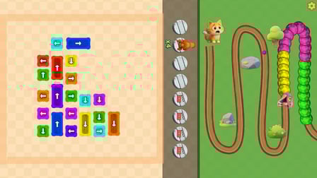Getting started is simple! Tap on the arrow boxes in the correct order to form a weapon of the same color. This weapon will automatically target and shoot at the snake, clearing the path to save the kitten. Each level presents a new challenge, requiring you to think on your feet and adapt your strategy.