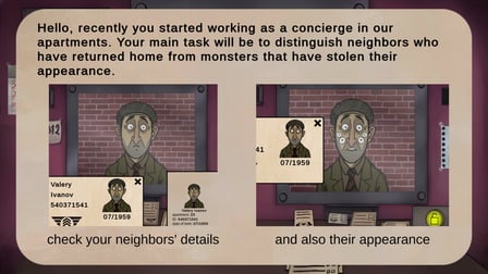 That's Not My Neighbor! Or is It? is an intriguing horror game that invites players into the eerie world of an apartment building filled with doppelgangers�human-imitating monsters that blend seamlessly with the residents. This 2D game creatively combines elements of suspense and strategy, challenging players to navigate their surroundings while discerning the real neighbors from their uncanny doubles. As a building guard tasked with identifying these doppelgangers, players must engage in a chilling objective that demands vigilance and critical thinking.