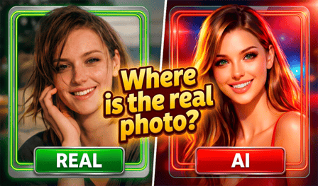 Where is the real photo? is a visual quiz that turns you into a digital detective. Your mission? Spot the AI-generated fake among real photos before you run out of lives. It's deceptively simple at first—but by Round 9, you'll be squinting at textures and shadows like a forensic analyst. Think you can outsmart the algorithms? This game proves the line between reality and AI is thinner than you think.