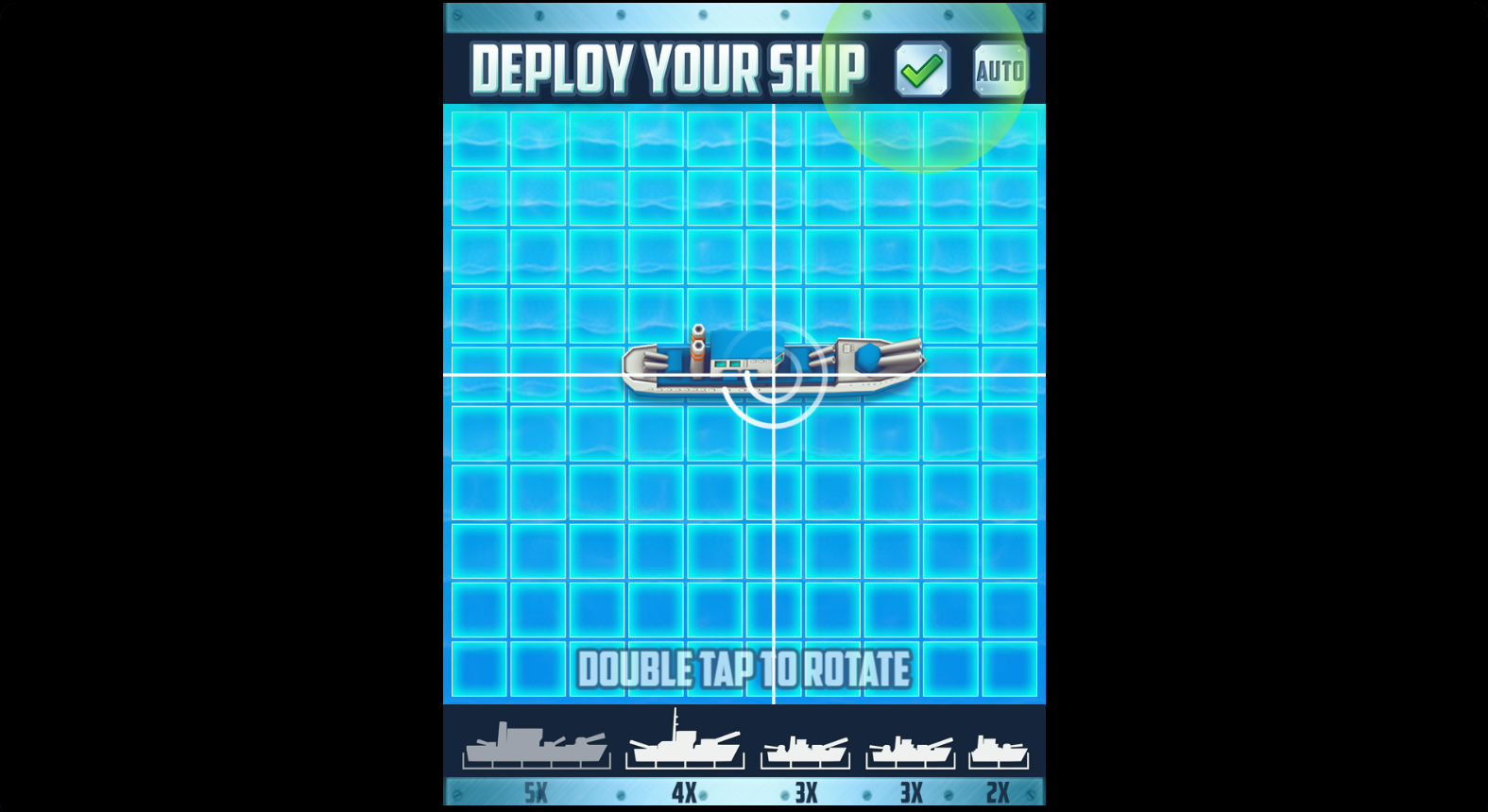 You start by placing five ships on your grid: the massive Carrier, Battleship, Cruiser, Submarine, and tiny Destroyer. Tap to position each ship, double-tap to rotate them horizontally or vertically. The game gives you an AUTO button if you want random placement, but smart positioning is half the fight. Spread them out to avoid clustered damage, or group them tightly to bait your opponent into wasting shots on empty water.