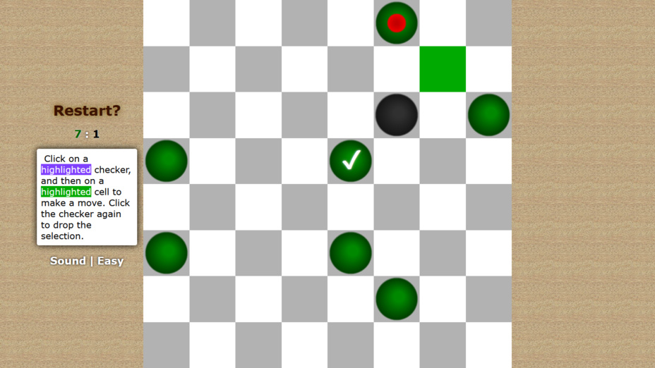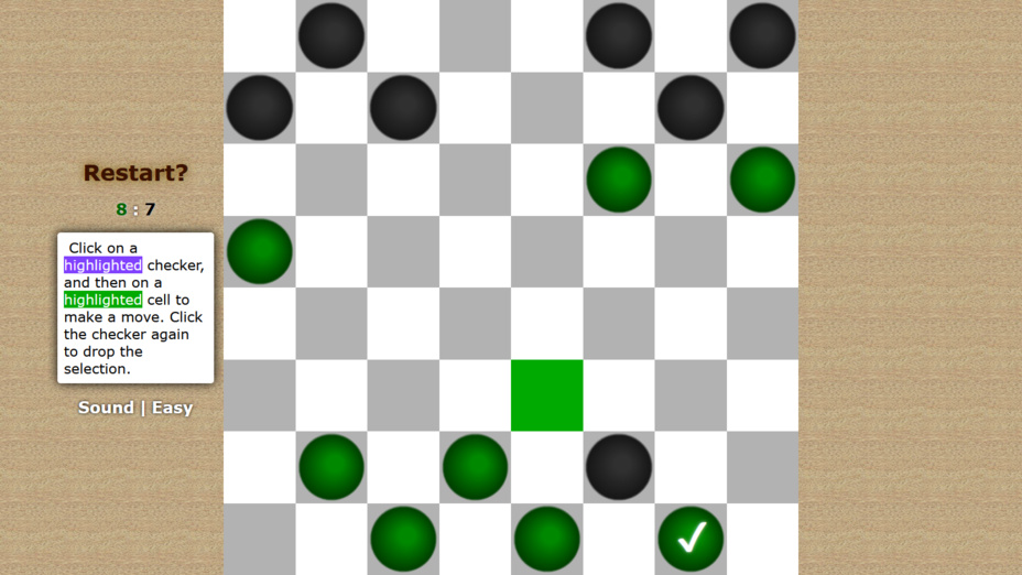 Checkers adalah gim sederhana namun sangat strategis di mana pemain bertujuan untuk menghilangkan semua bidak lawan atau menghalangi mereka untuk bergerak. Permainan ini dimainkan di papan berukuran 8x8 dengan 12 buah per pemain. Bidak bergerak secara diagonal dan dapat menangkap bidak lawan dengan melompati bidak tersebut. Permainan menjadi lebih menarik saat bidak dinobatkan menjadi raja, mendapatkan kemampuan untuk bergerak maju mundur, menambahkan lapisan strategi tambahan.