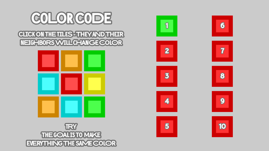 Color Code menggabungkan kesederhanaan dengan gameplay yang rumit. Estetika visualnya minimalis, memungkinkan pemain untuk terjun sepenuhnya ke dalam tantangan beralih dari array warna yang kacau menjadi satu warna harmonis di seluruh papan. Progresi tingkat kesulitan yang bertahap menjaga pemain tetap terlibat saat mereka menghadapi berbagai ukuran grid, mulai dari pengaturan 2x2 yang nyaman hingga konfigurasi 5x5 yang lebih menantang.