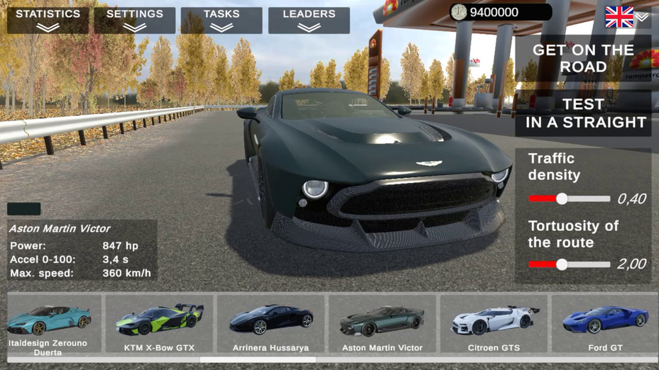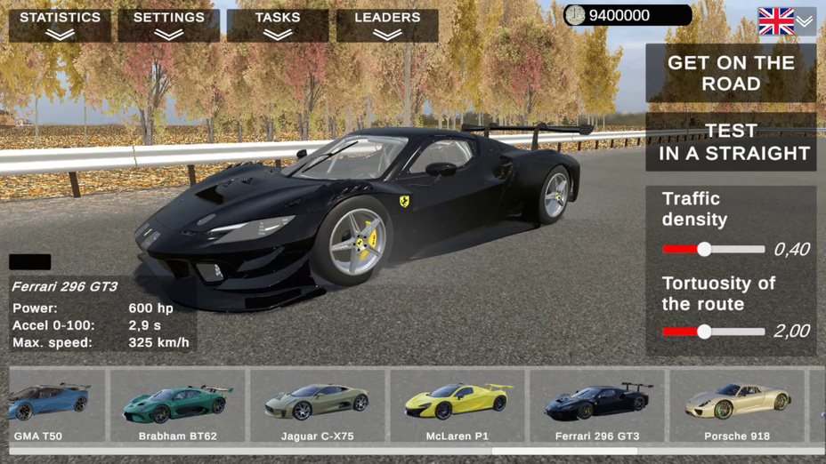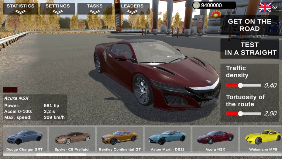 Cool Cars Highway menampilkan berbagai kendaraan, termasuk hypercar, supercar, dan mobil standar, masing-masing dengan atribut dan karakteristik penanganan yang unik.