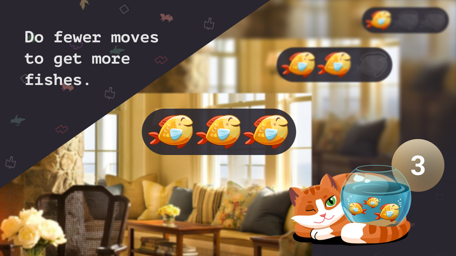 Tujuannya adalah untuk memecahkan teka-teki dengan gerakan sesedikit mungkin untuk mendapatkan jumlah ikan maksimum, sehingga membuat anak-anak kucing senang.